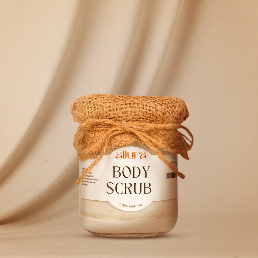 سكر أو ملح طبيعي، حبوب طبيعية مطحونة، قهوة، زيوت طبيعية (جوز الهند، اللوز، الزيتون، الجوجوبا، الأرجان)، زبدة الشيا، عسل، فيتامين E، وجل الصبار.